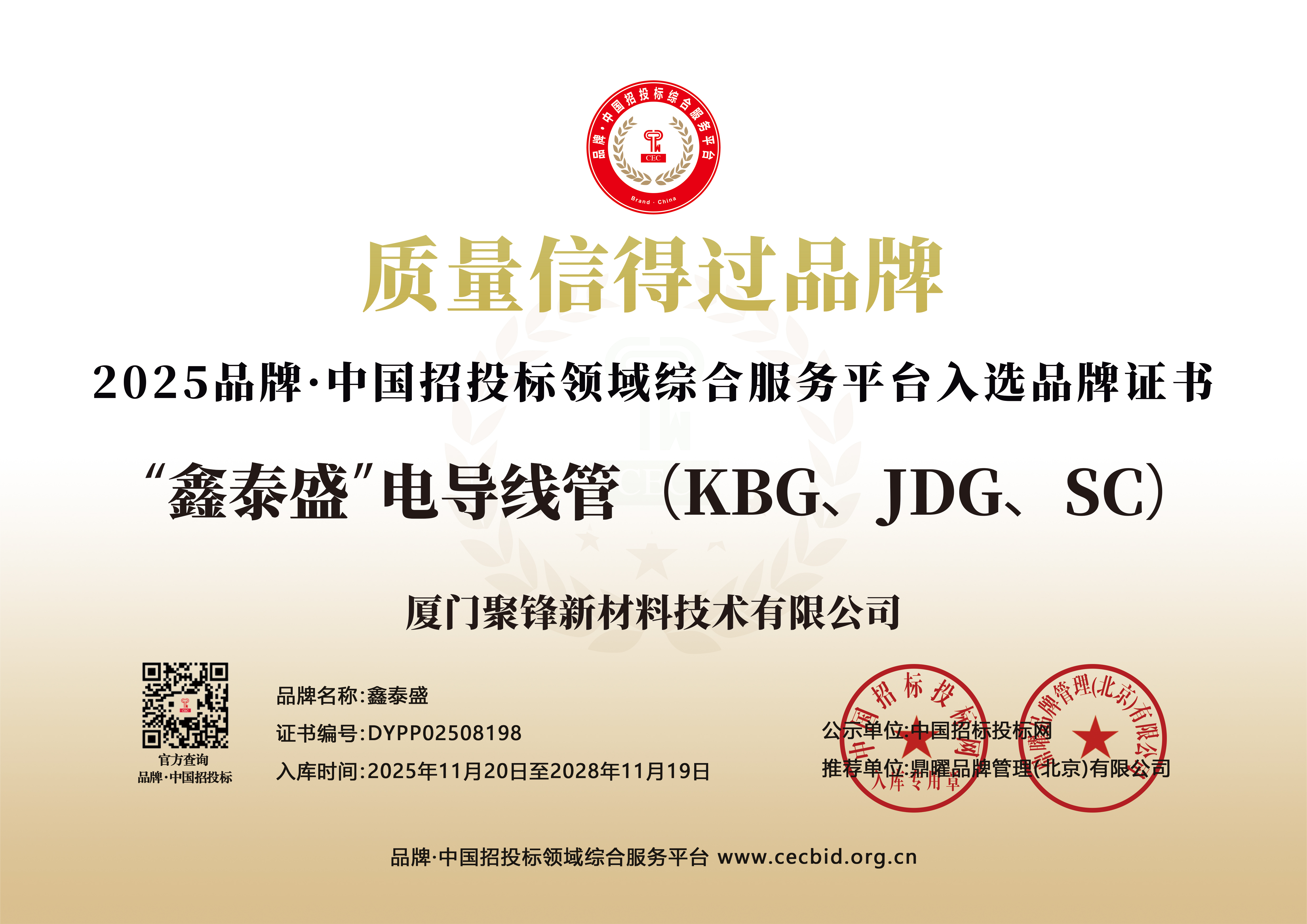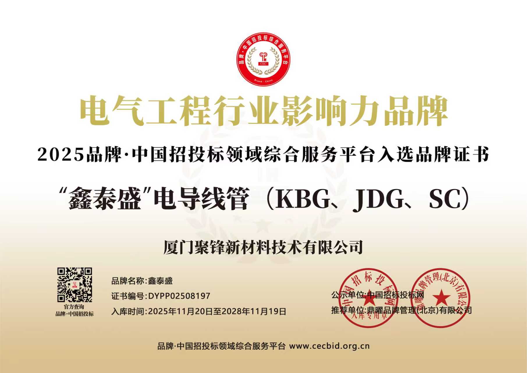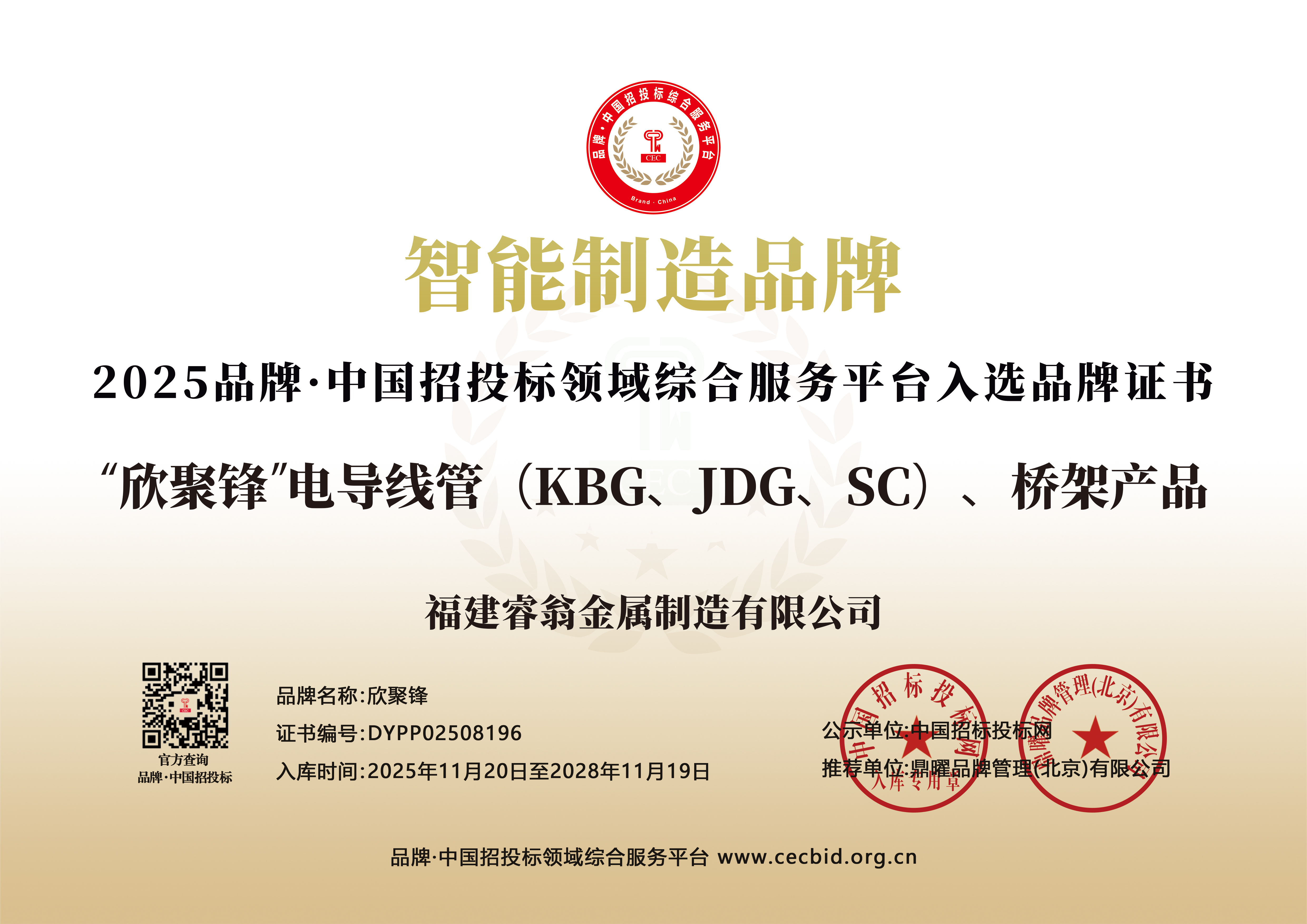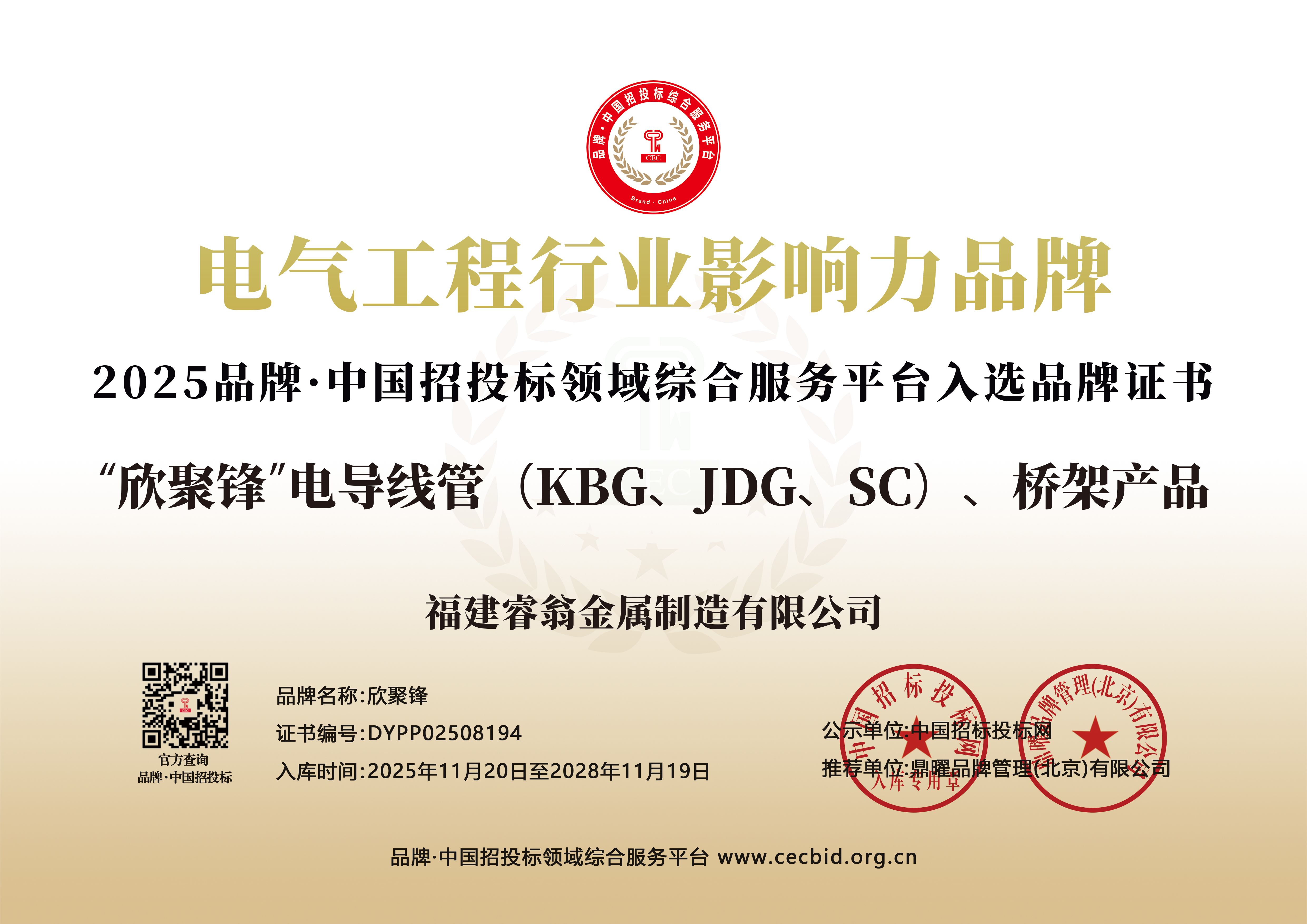“欣聚锋”电导线管(KBG、JDG、SC)、桥架产品入选“电气工程行业影响力品牌”、“质量信得过品牌”“智能制造品牌”“招投标领域推荐品牌”