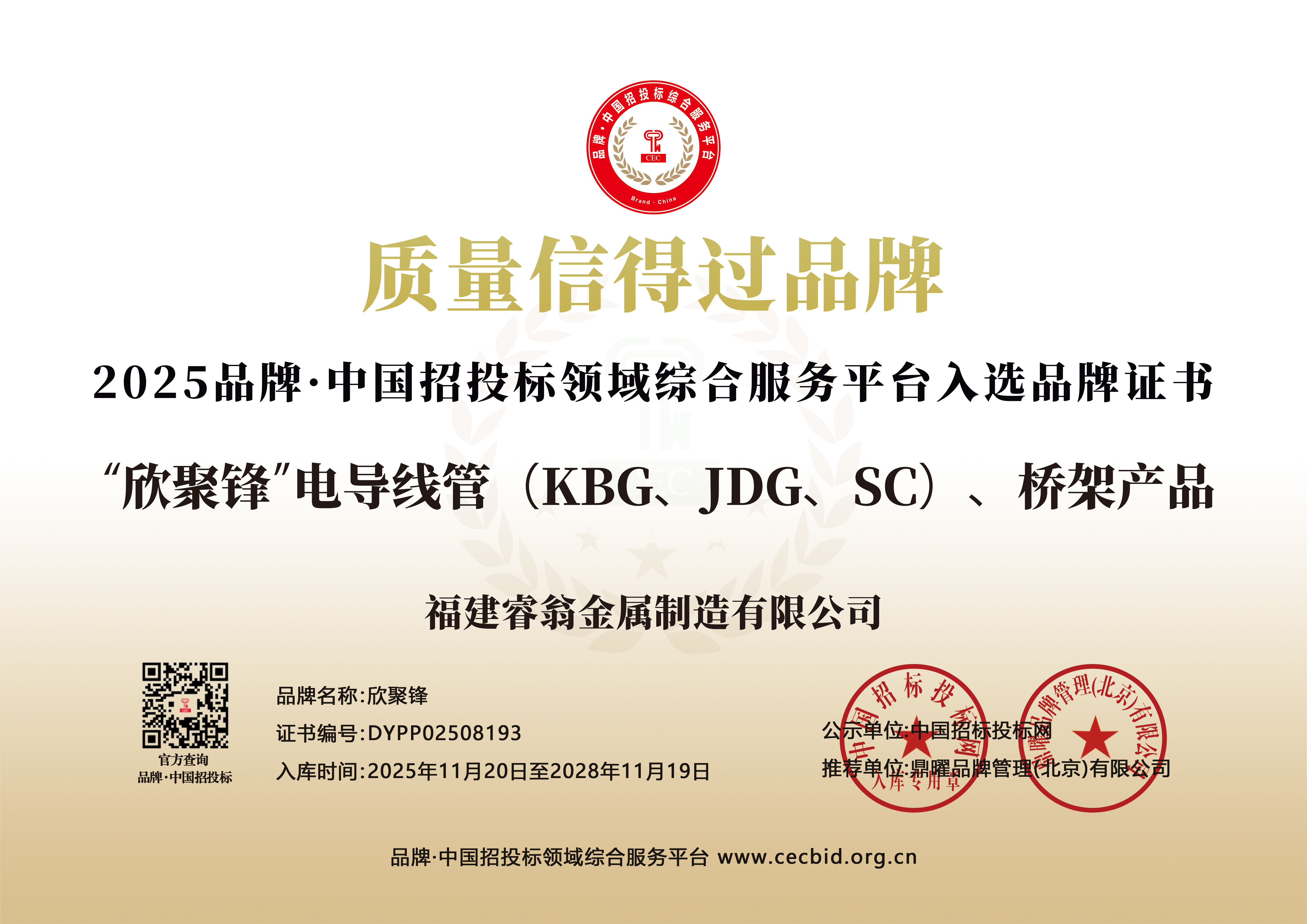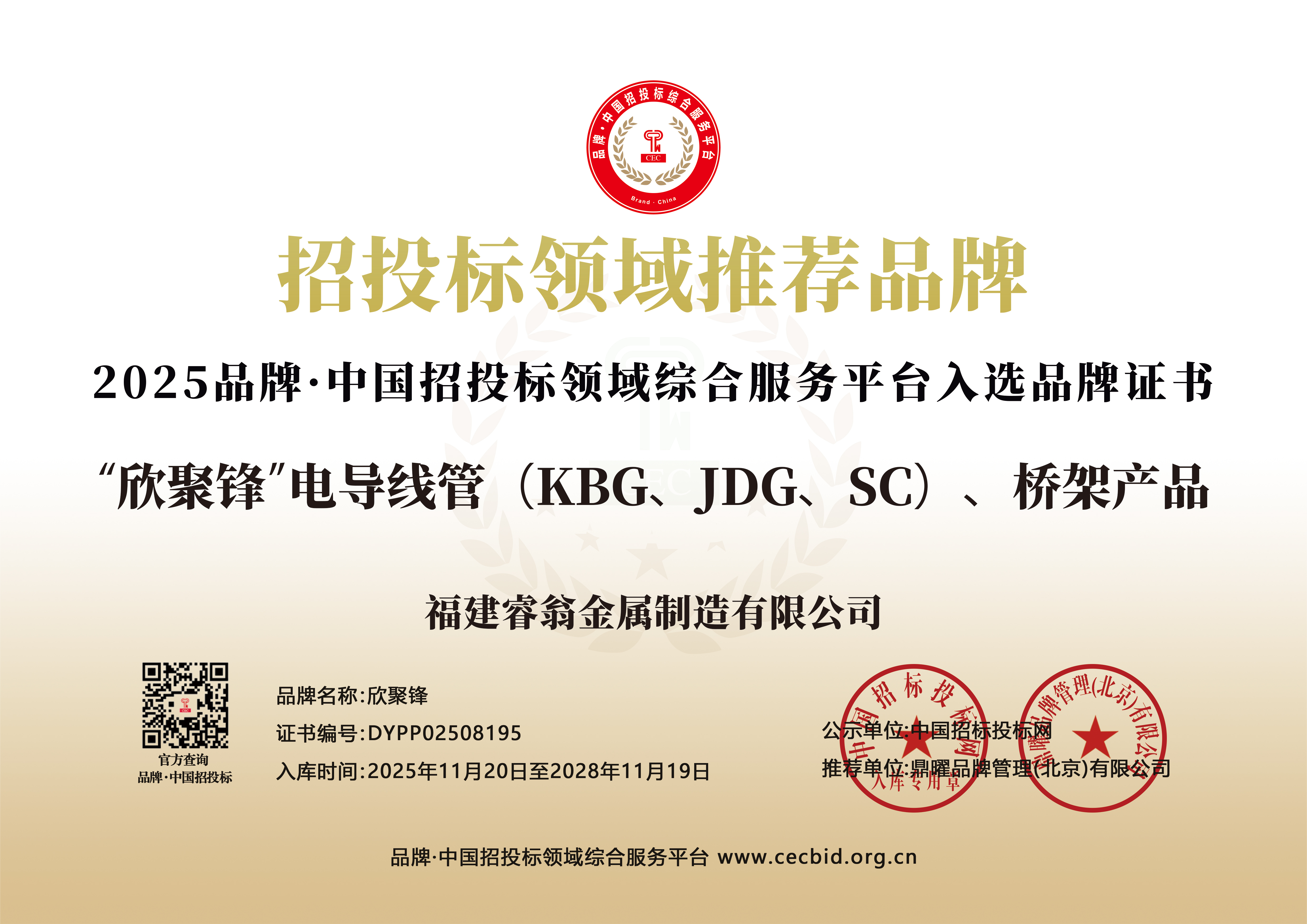 “欣聚锋”电导线管(KBG、JDG、SC)、桥架产品入选“电气工程行业影响力品牌”、“质量信得过品牌”“智能制造品牌”“招投标领域推荐品牌”