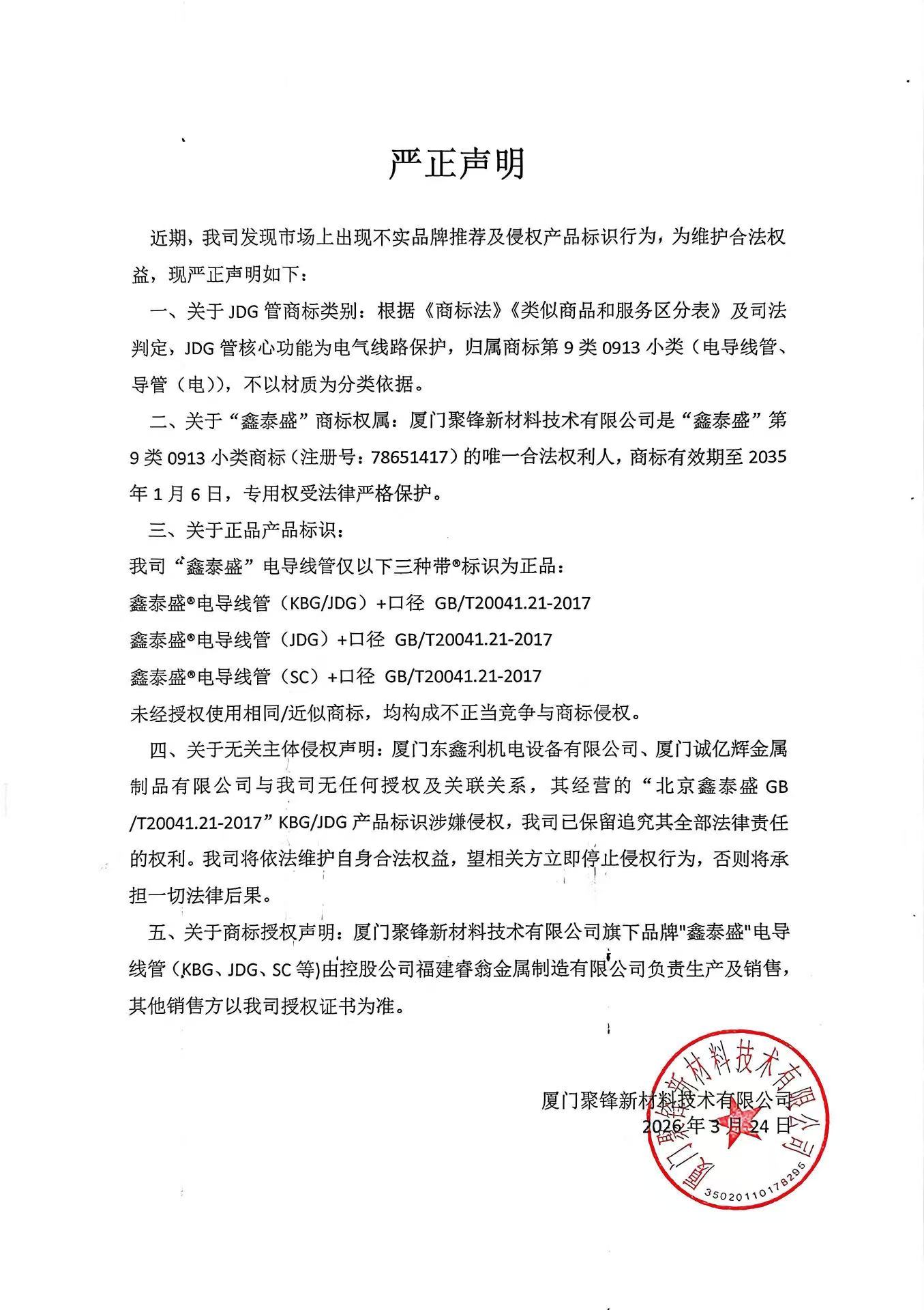 五、关于商标授权声明:厦门聚锋新材料技术有限公司旗下品牌"鑫泰盛"电导线管(KBG、JDG、SC等)由控股公司福建睿翁金属制造有限公司负责生产及销售,其他销售方以我司授权证书为准。